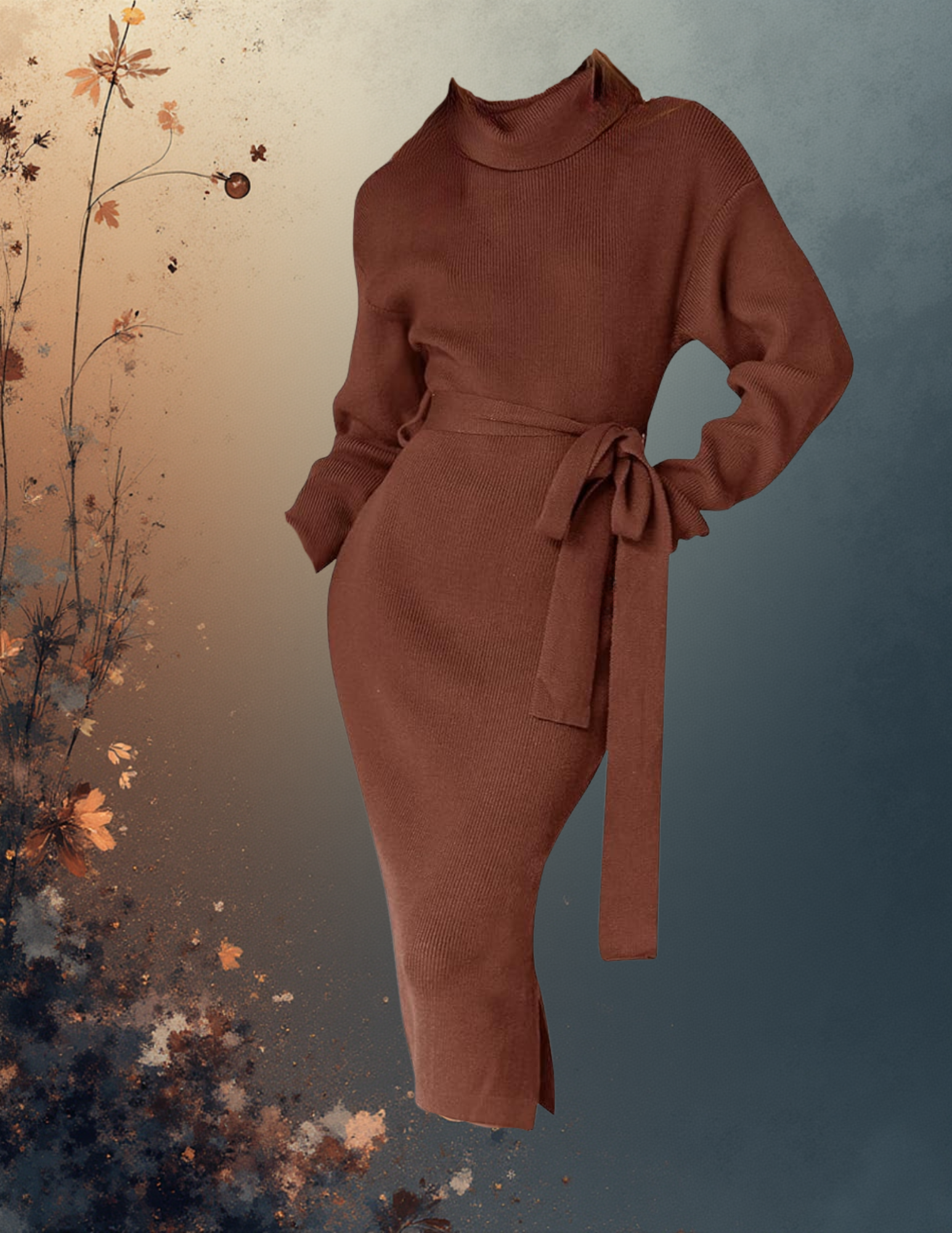 Women’s Turtleneck Sweater Midi Dress Long Sleeve Ribbed Knit Slit Dress with Belt